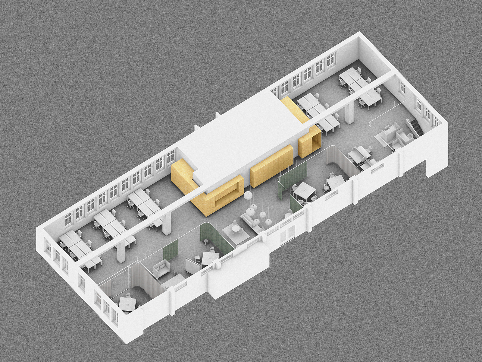 Im Zentrum des alten Postraums steht ein überdimensionales Paket mit Stauraum, Schliessfächern und Telefon-Nischen. Ein Vorhangsystem – angelehnt an das Thema Logistik – schafft flexibel abtrennbare Arbeits- und Besprechungsbereiche. So entstehen Räume für konzentriertes Arbeiten, Besprechungen, Workshops oder Begegnungen.